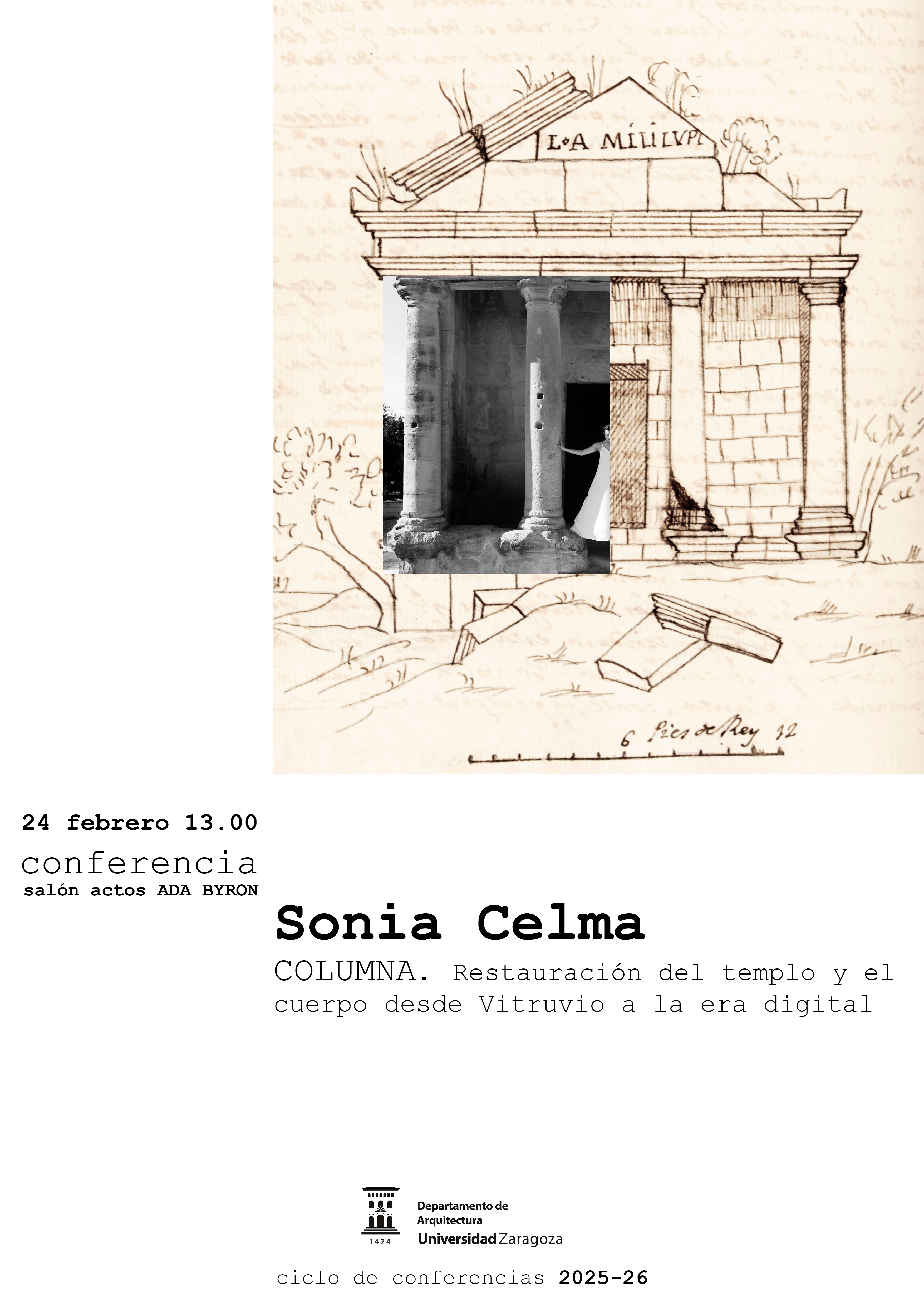 El próximo martes, 24 de febrero a las 13:00 horas, en el salón de actos del edificio Ada Byron, EINA, tendrá lugar la conferencia de Sonia Celma "Columna. Restauración del templo y el cuerpo desde Vitruvio a la era digital", organizada por el Departamento de Arquitectura.